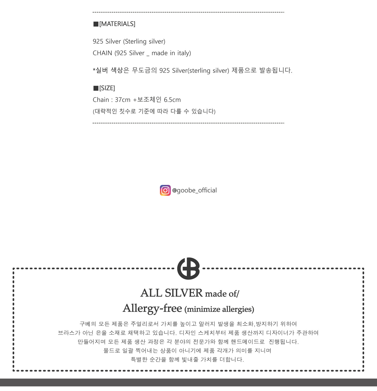* GOOBE는 귀금속으로서 상품의 가치를 높이고 착용 시 알레르기 반응을 최소화 하기 위해 은 함량을 준수한 925 Silver만을 사용합니다.