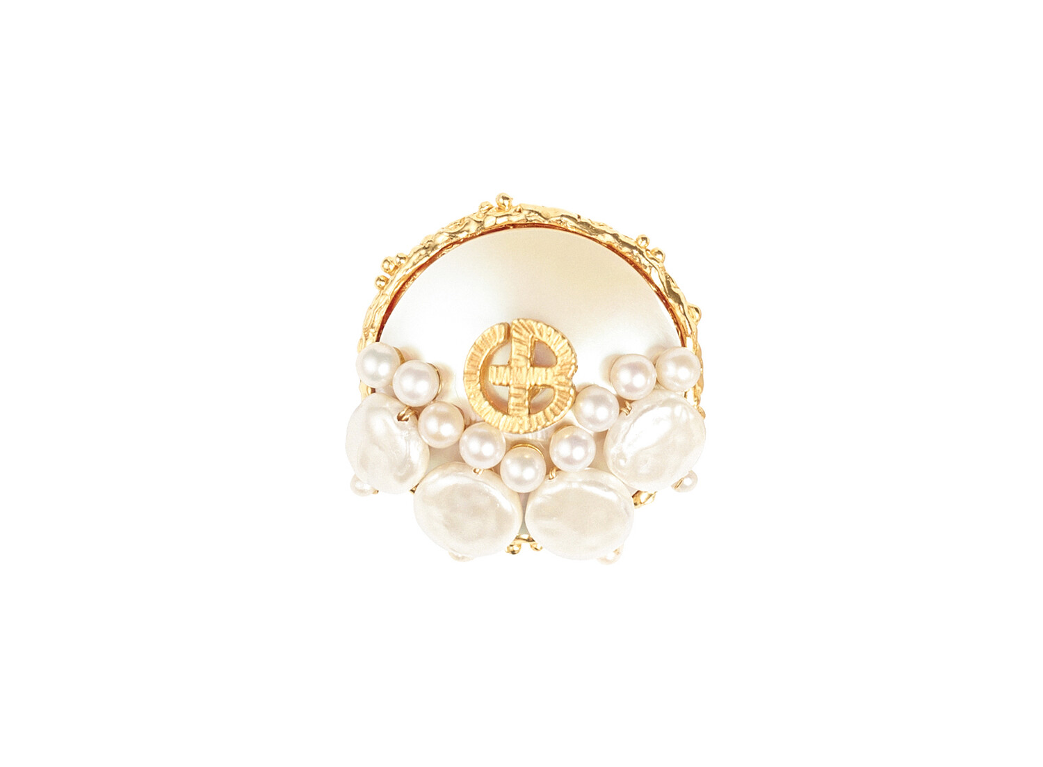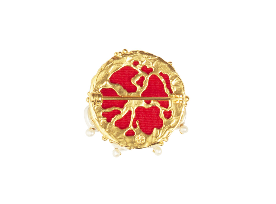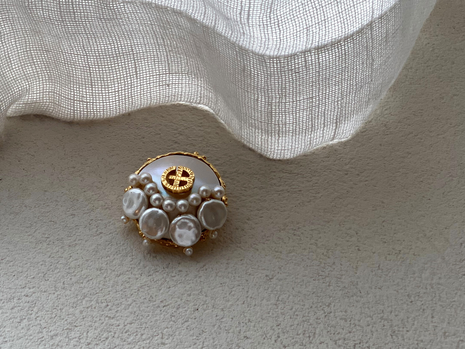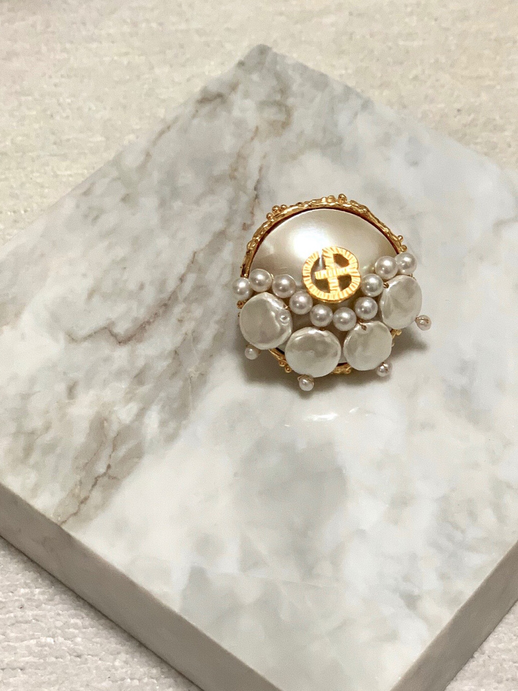 각도에 따라 다른 빛을 내는 자개 위에 작은 진주들로 선과 점을 그려 자개의 빛에 진주의 빛을 더한 고급스러운 브로치입니다. 자개가 만들어 내는 큰 빛과 각양의 진주들이 반사하는 작은 빛들이 구베의 미학으로 어우러져 무수히 많은 점(붓 터치)들이 유려한 색채를 이뤄내는 모네의 그림처럼 한 폭의 디자인을 그립니다.