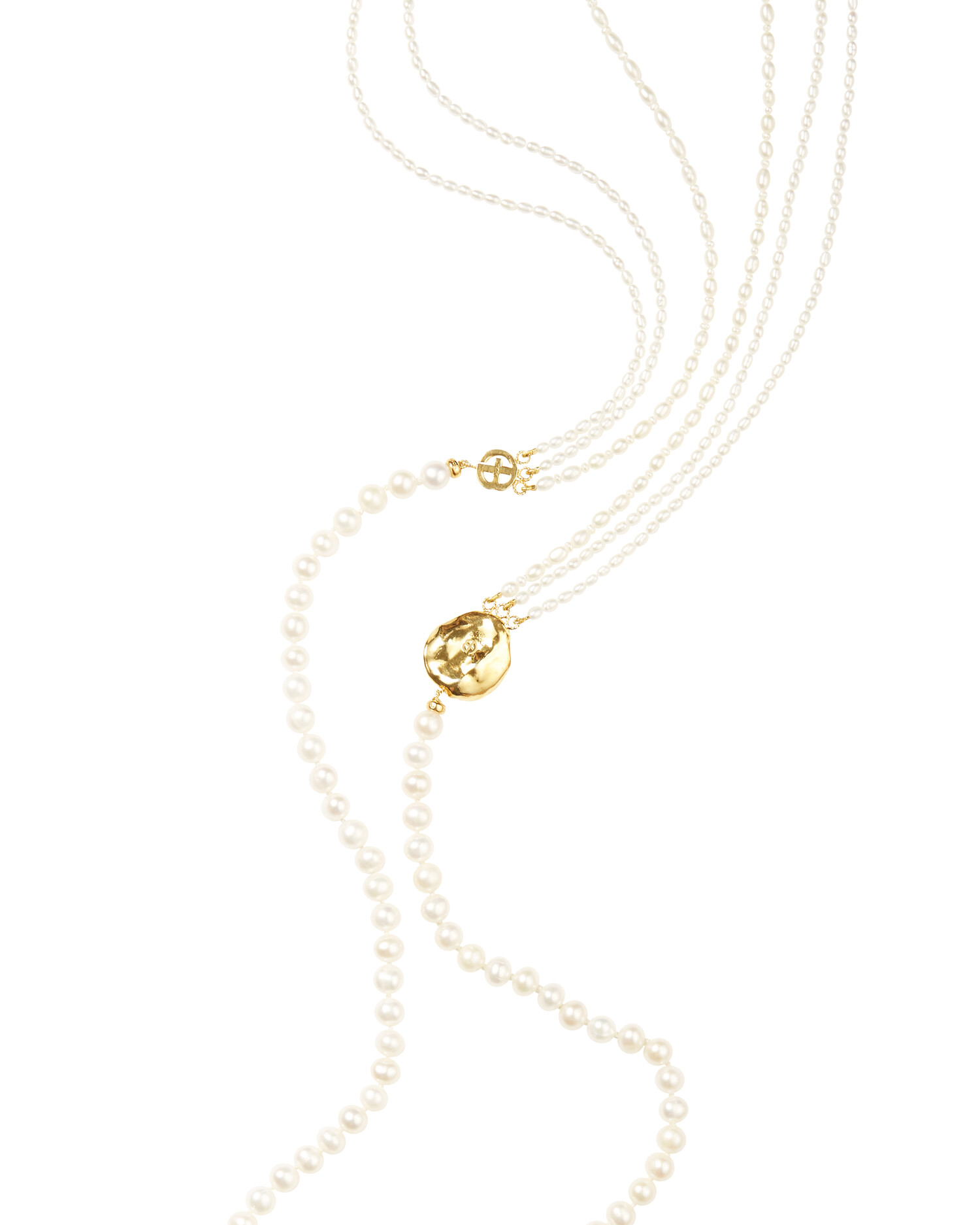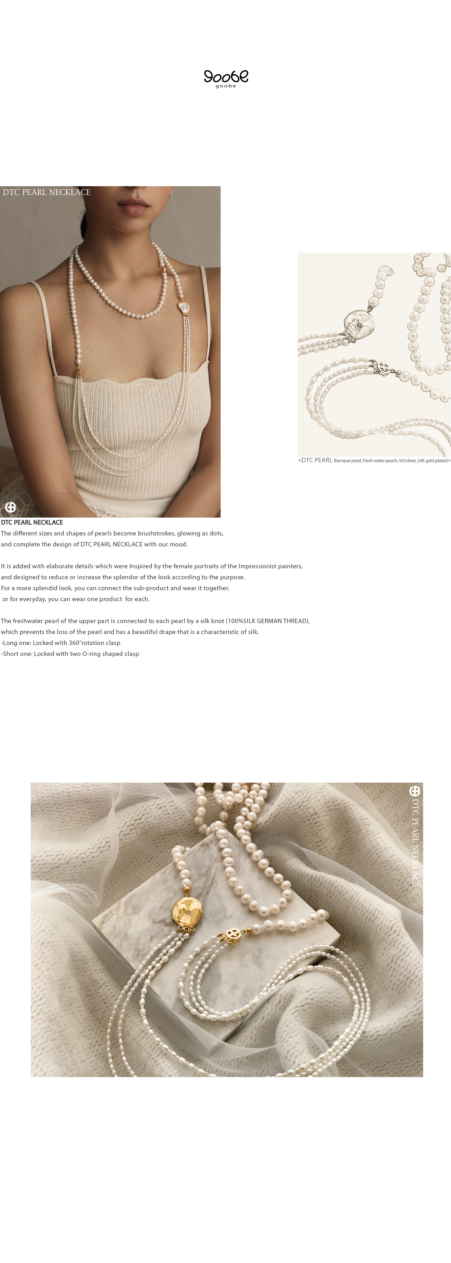 크기와 모양이 서로 다른 진주들이 다양한 붓 터치가 되어 점을 이루고 그 빛으로 구베의 구상을 완성하도록 디자인된 진주목걸이.