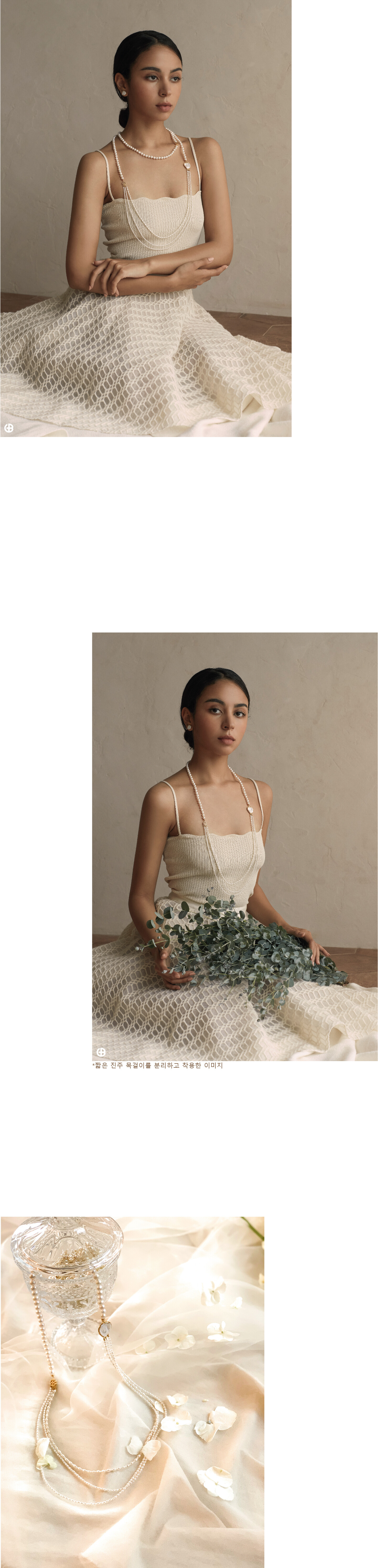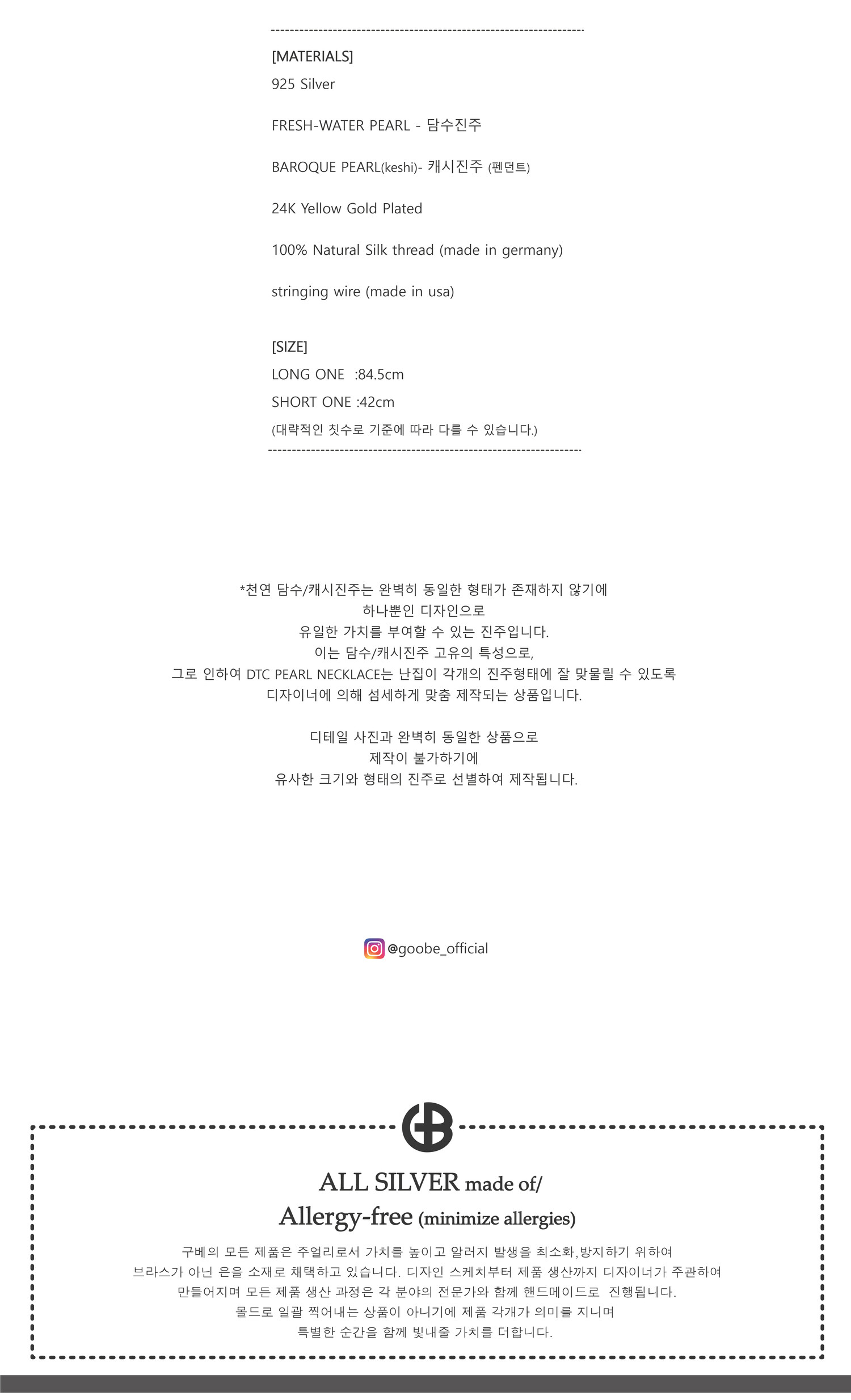 상단의 담수진주는 각 알마다 실크매듭(100%SILK GERMAN THREAD)으로 연결되어 진주가 서로 마모되거나 끊어졌을 경우 진주의 유실을 막고 실크의 특성인 아름다운 드레이프를 갖습니다.