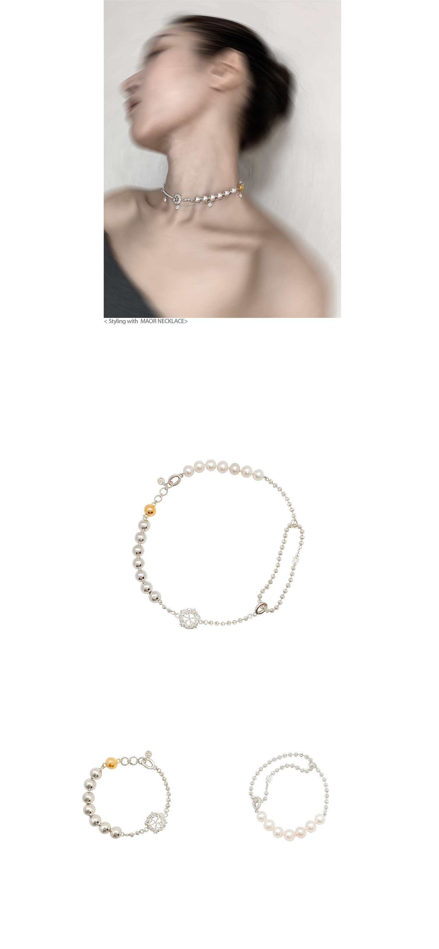 ETOILE GB NECKLACE provides a variety of 3 types of jewelry with one. It's a transfomable necklace which consists of ETOILE G BRACELET and ARLES B BRACELET, and you can enjoy the look with each complete bracelet separately. ----------------------------------------------------------------------------------------------------------------------------------------