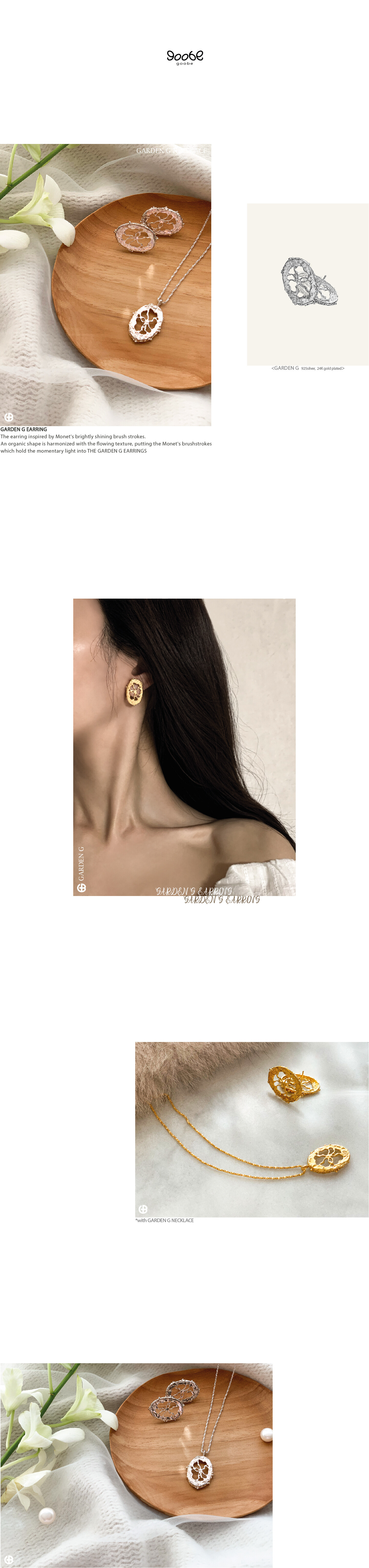 찰나의 빛을 가둔 모네의 붓 터치를 금속 표면의 흘러내리는 듯한 질감과 그림자를 표현한 유기적 형상으로 아울러 GARDEN G EARRING 안에 담습니다.