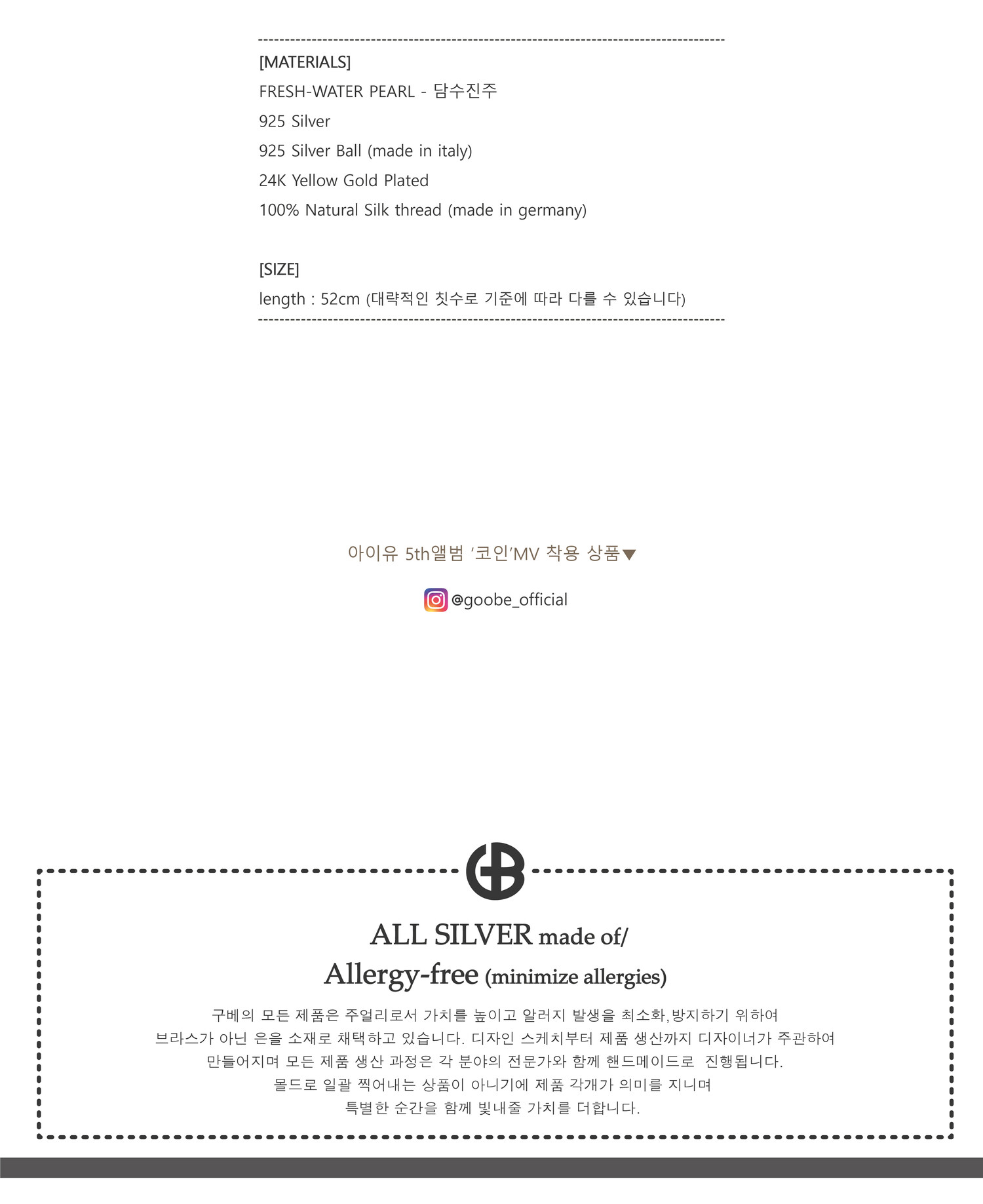 * GOOBE는 귀금속으로서 상품의 가치를 높이고 착용 시 알레르기 반응을 최소화 하기 위해 은 함량을 준수한 925 Silver만을 사용합니다.