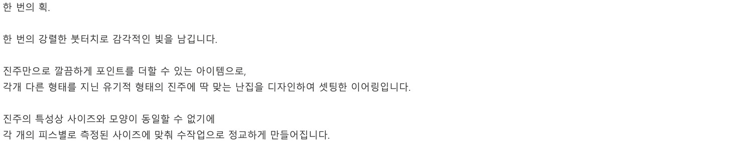 진주만으로 깔끔하게 포인트를 더할 수 있는 아이템으로, 각개 다른 형태를 지닌 유기적 형태의 진주에 딱 맞는 난집을 디자인하여 셋팅한 이어링입니다.
