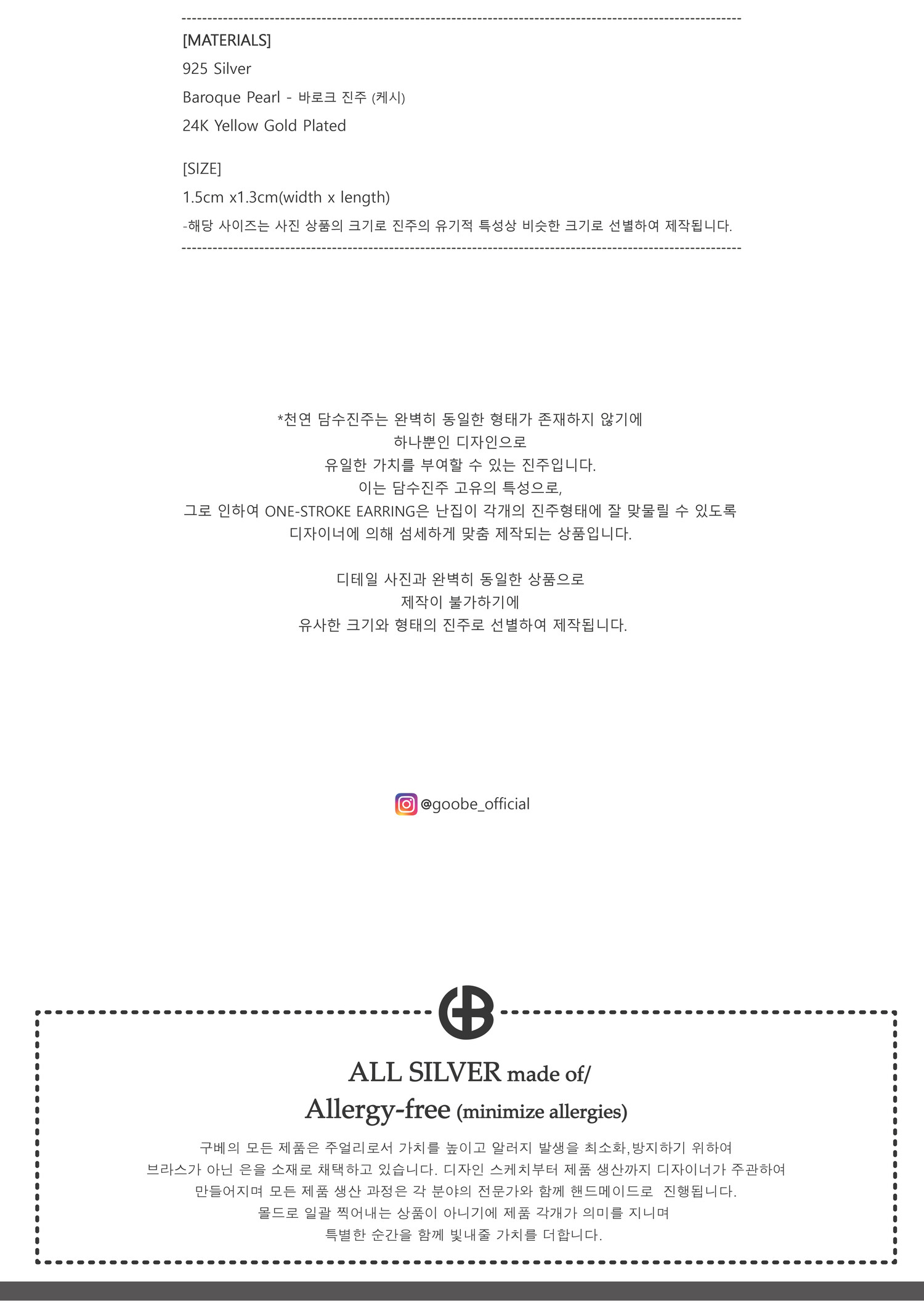 * GOOBE는 귀금속으로서 상품의 가치를 높이고 착용 시 알레르기 반응을 최소화 하기 위해 은 함량을 준수한 925 Silver만을 사용합니다.