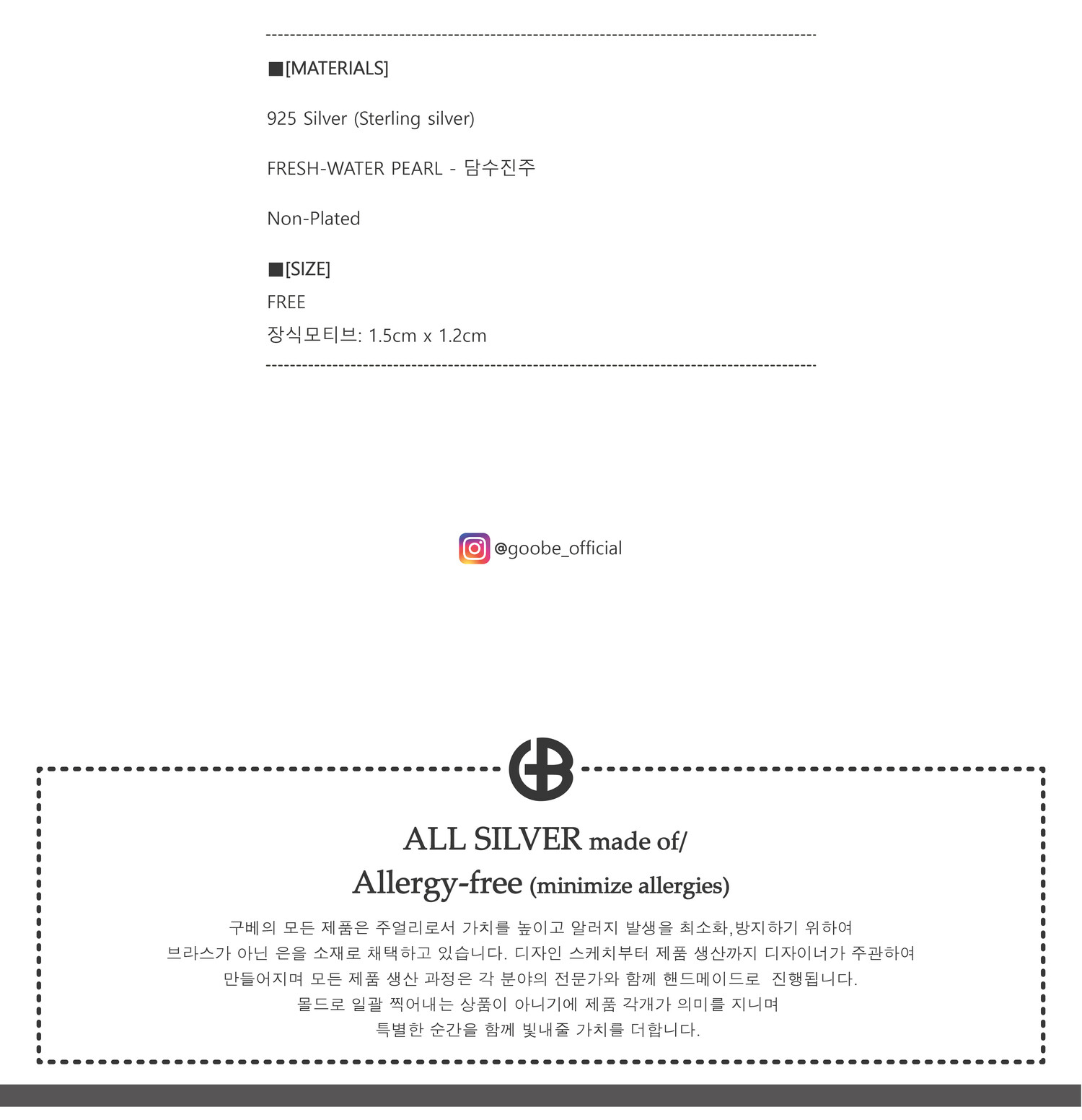 * GOOBE는 귀금속으로서 상품의 가치를 높이고 착용 시 알레르기 반응을 최소화 하기 위해 은 함량을 준수한 925 Silver만을 사용합니다.