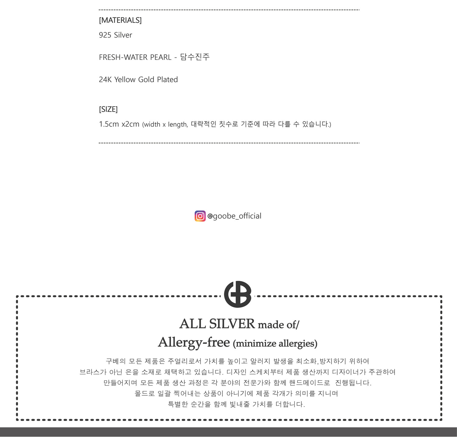 * GOOBE는 귀금속으로서 상품의 가치를 높이고 착용 시 알레르기 반응을 최소화 하기 위해 은 함량을 준수한 925 Silver만을 사용합니다.