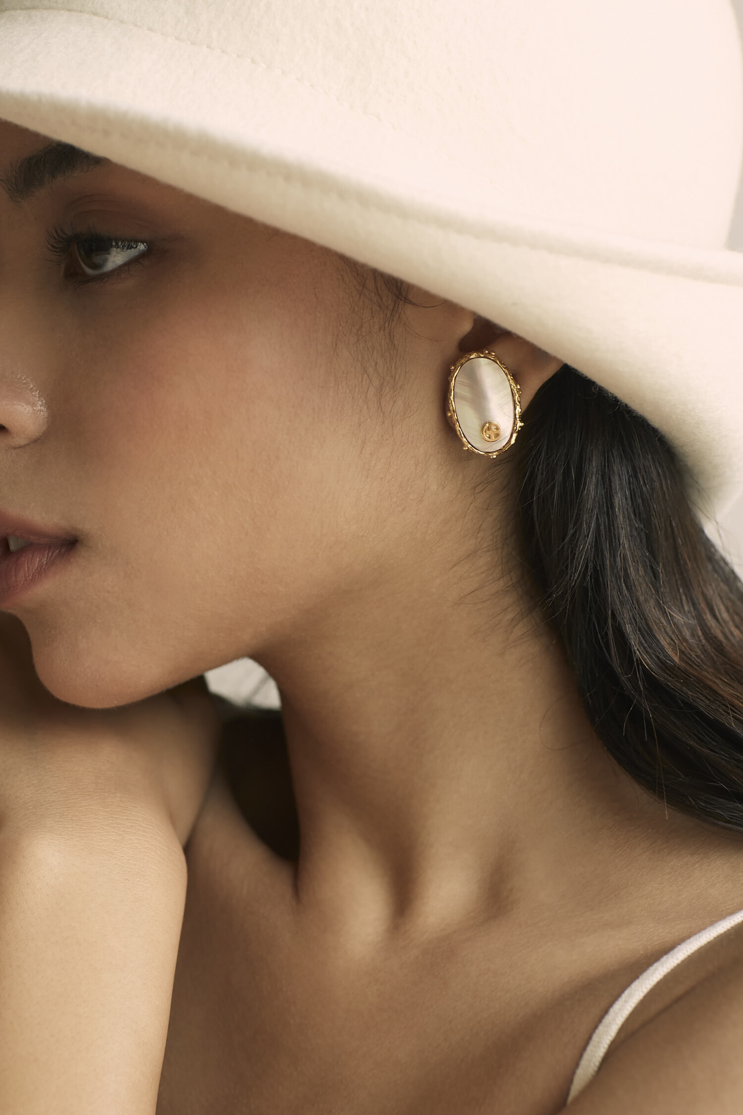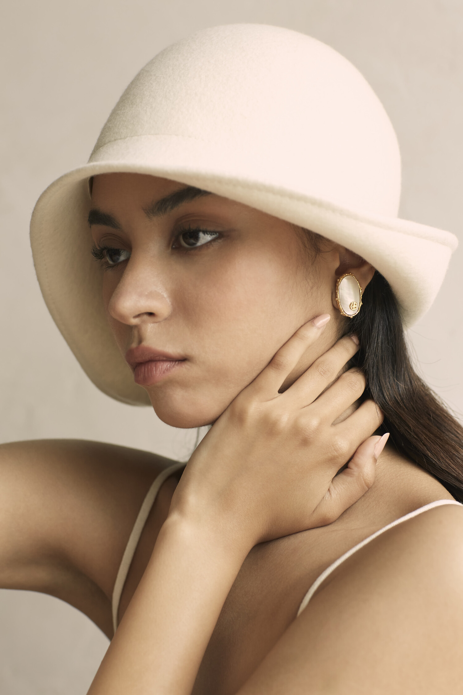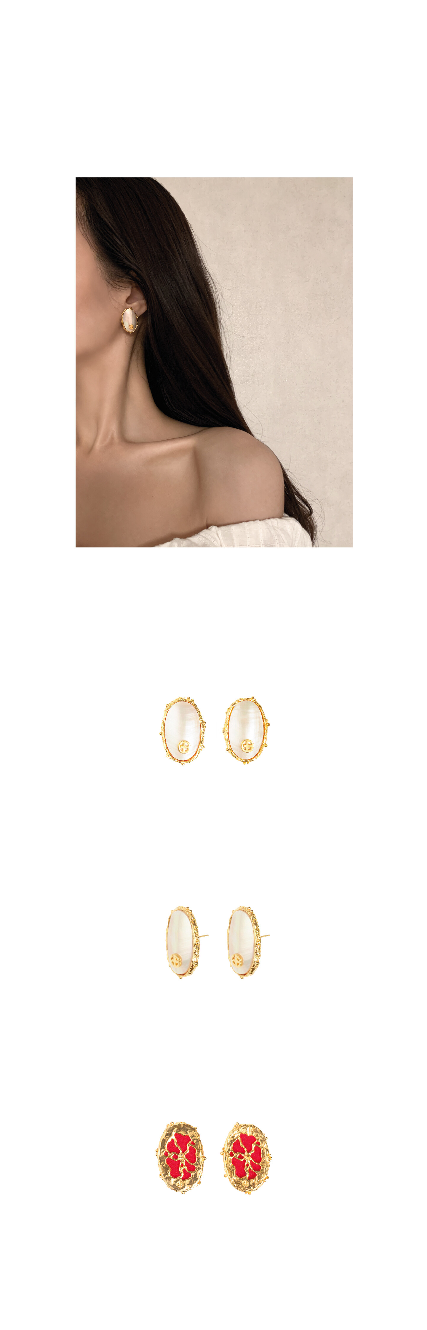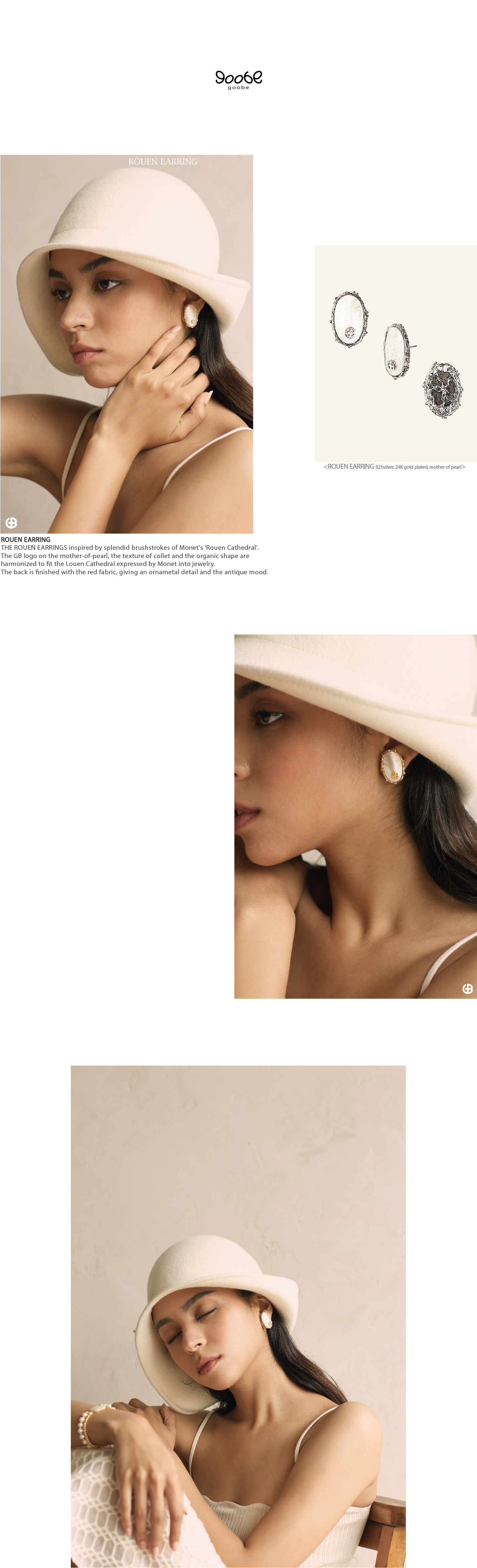 밝게 빛나는 자개 안의 구베 로고, 난집 표면의 흘러내리는 듯한 붓 터치 질감과 유기적 형상이 어우러져 모네가 표현한 루앙 대성당을 주얼리로 담습니다.