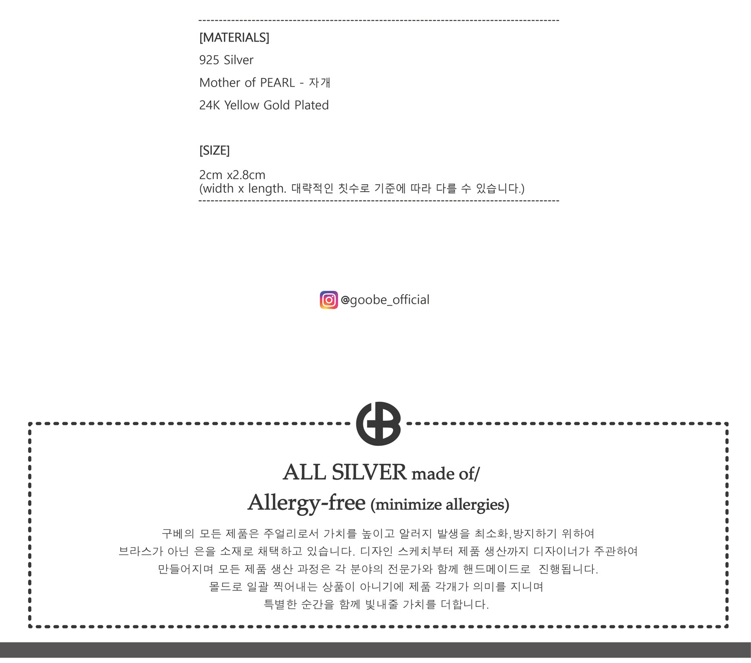* GOOBE는 귀금속으로서 상품의 가치를 높이고 착용 시 알레르기 반응을 최소화 하기 위해 은 함량을 준수한 925 Silver만을 사용합니다.