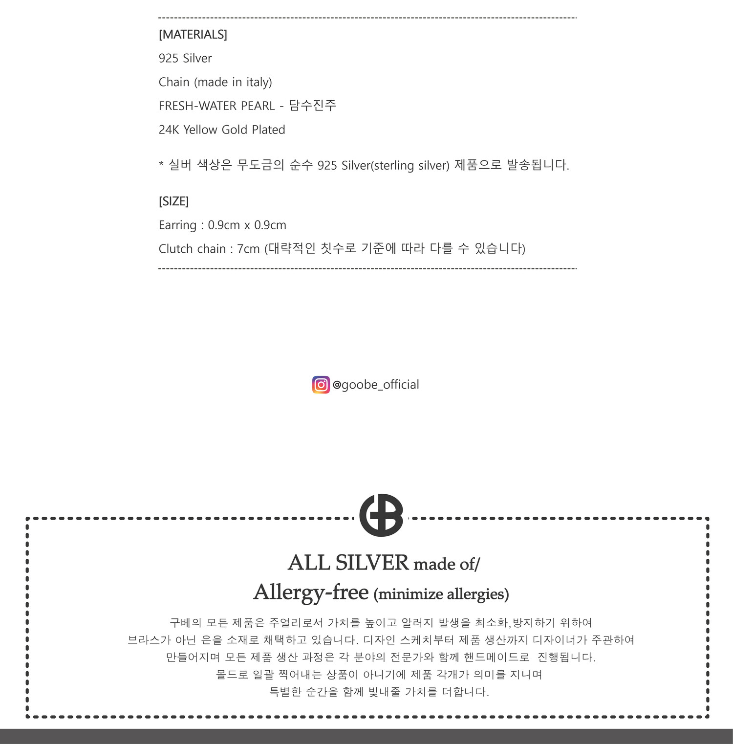 * GOOBE는 귀금속으로서 상품의 가치를 높이고 착용 시 알레르기 반응을 최소화 하기 위해 은 함량을 준수한 925 Silver만을 사용합니다.