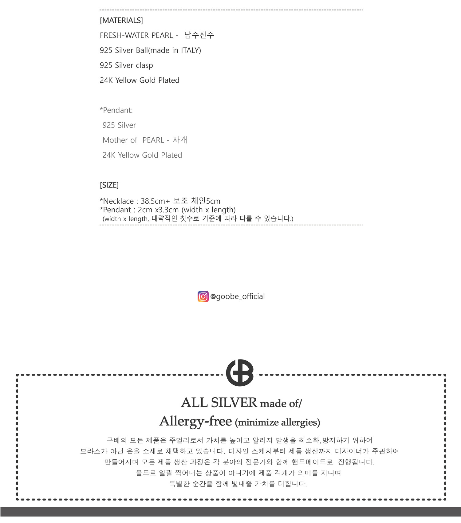 * GOOBE는 귀금속으로서 상품의 가치를 높이고 착용 시 알레르기 반응을 최소화 하기 위해 은 함량을 준수한 925 Silver만을 사용합니다.